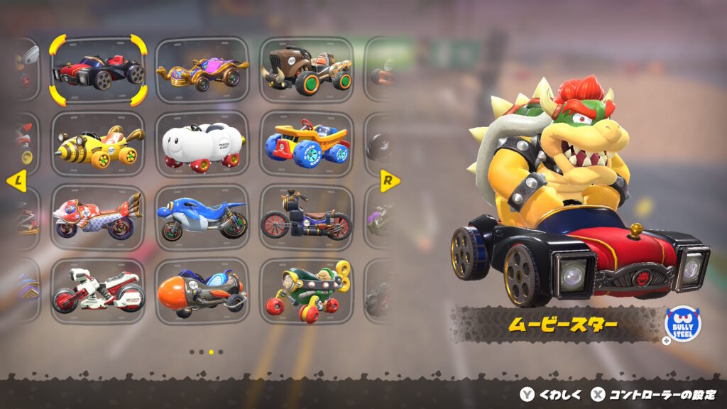 「クッパ+ムービースター」は、加速や曲がりやすさは低いですが、全体のスピードが高いスピード特化のカスタムとなっており、タイムアタックでもおすすめです。