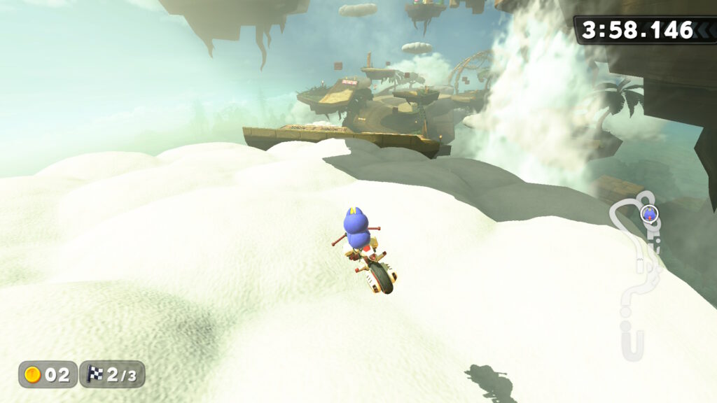 手前のジャンプ台でジャンプアクションは行わず、そこでスティックを倒して車体を斜めにしたまま雲を踏みましょう。