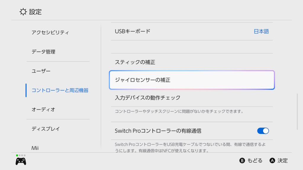 マリオカートワールド及びSwitchにはジャイロセンサーの細かい感度調整機能はないので、基本は操作の慣れで対応するか、ジャイロの精度が落ちたと感じた場合はSwitch本体の設定から「ジャイロセンサーの補正」を行いましょう。