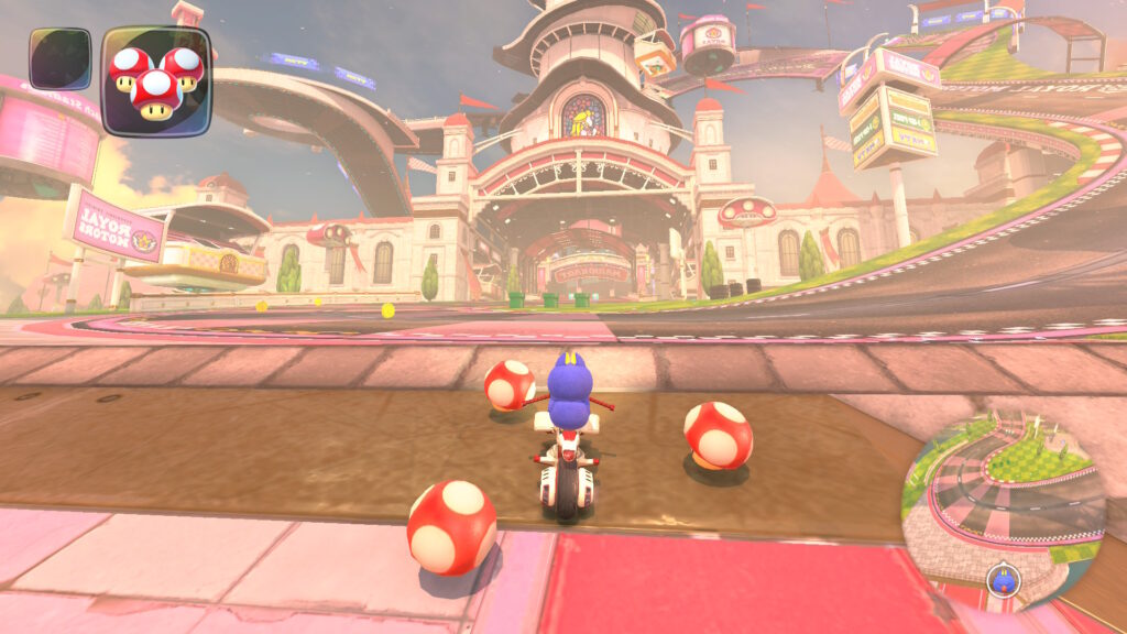 マリオカートワールドのピーチスタジアムはピーチ城を昇ってまた下っていくというコース設計になっています。ピーチビーチは、ピーチ城の周りのビーチや海を走るコースになっています。