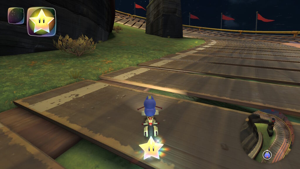 スタート地点から逆走して線路を少し進み、すぐ左側にジャンプしてヨッシーズの横を通りそのまま真っ直ぐ進みます。赤い橋の左側のレールに乗って進み、タイミングよく左側にジャンプして上からピーチメダルを獲得できます。