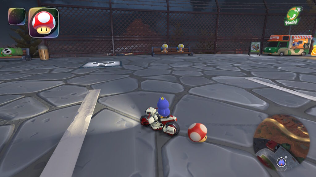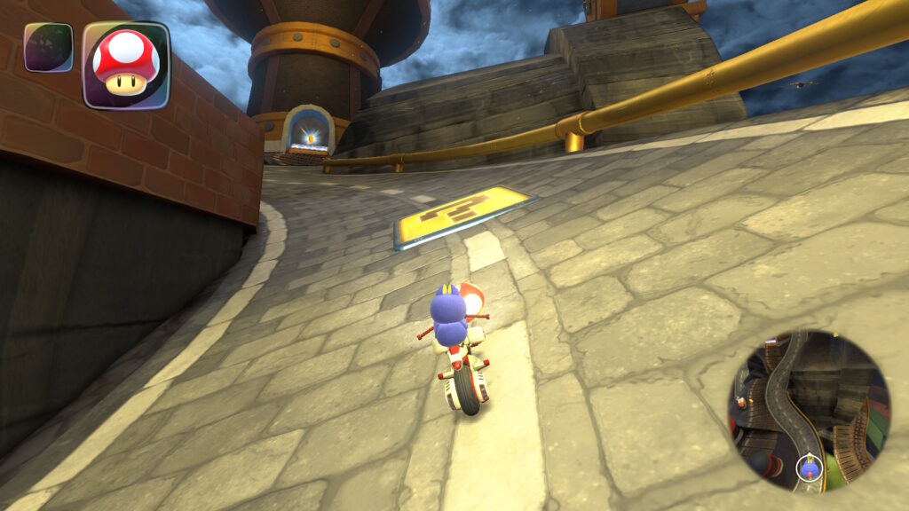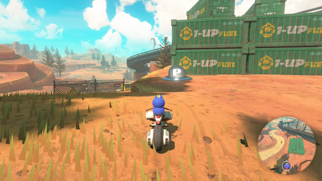 スタート地点から逆走し、3つのアイテムボックスがある場所で右に曲がりそのまま真っ直ぐ進むと柵の近くにPスイッチがあります。