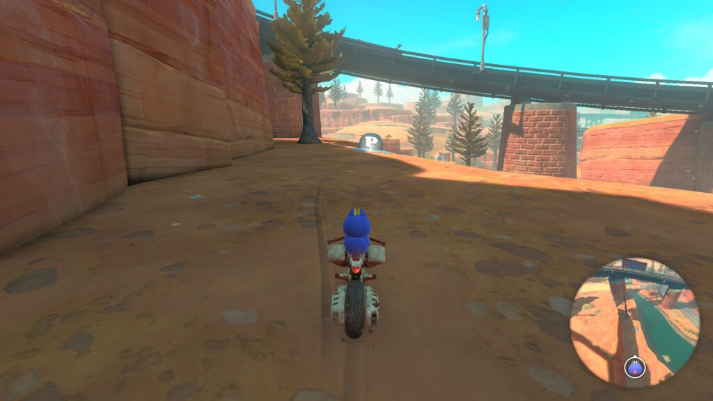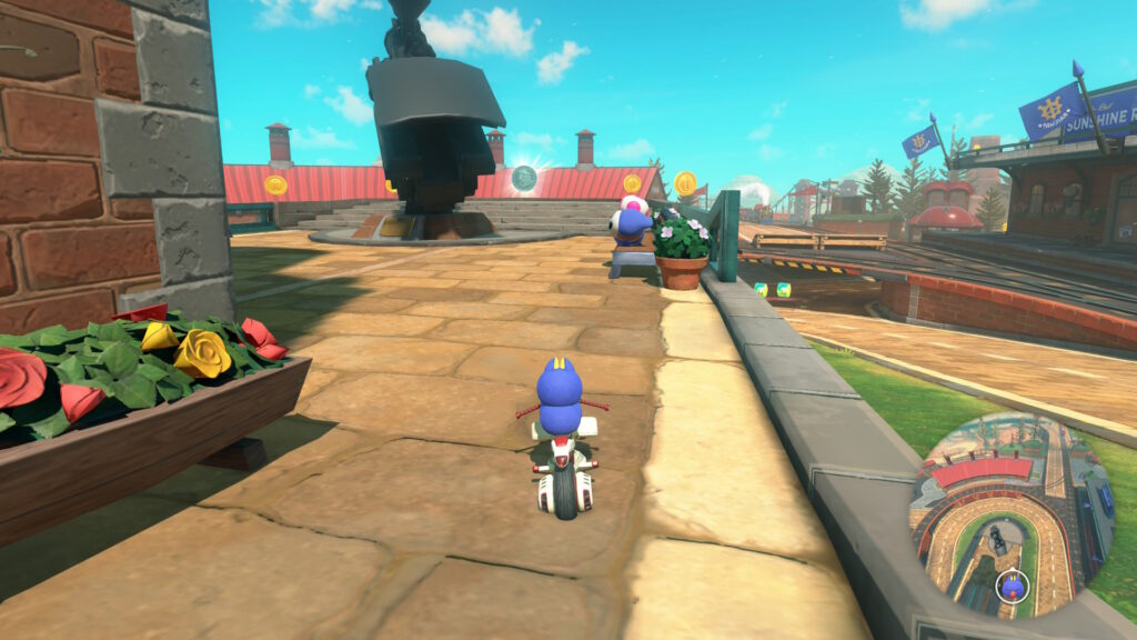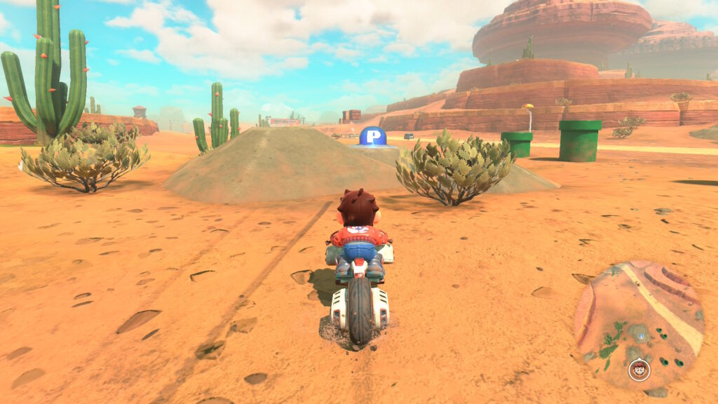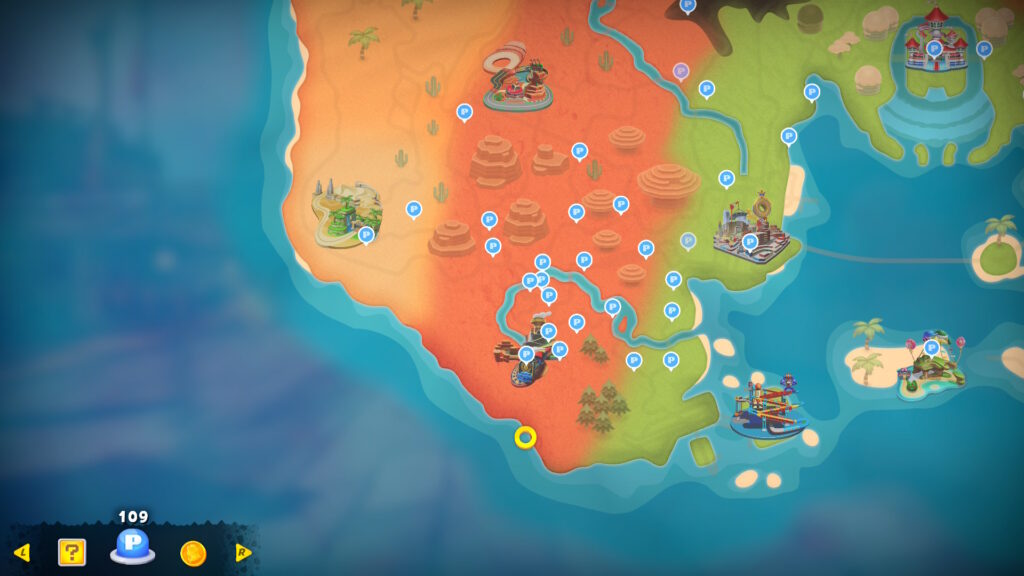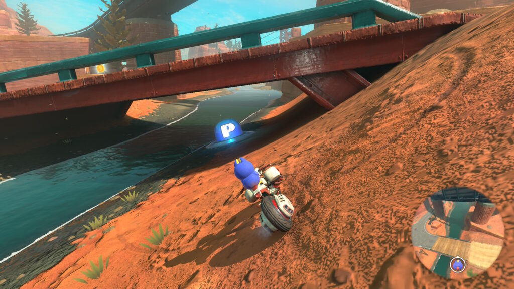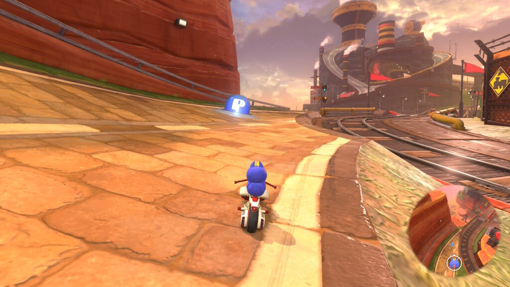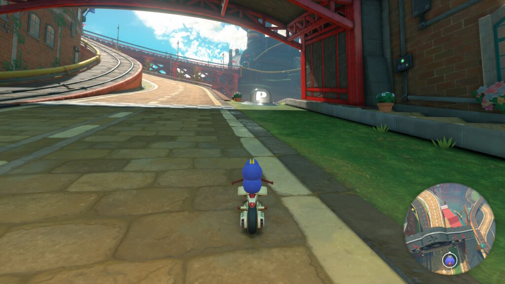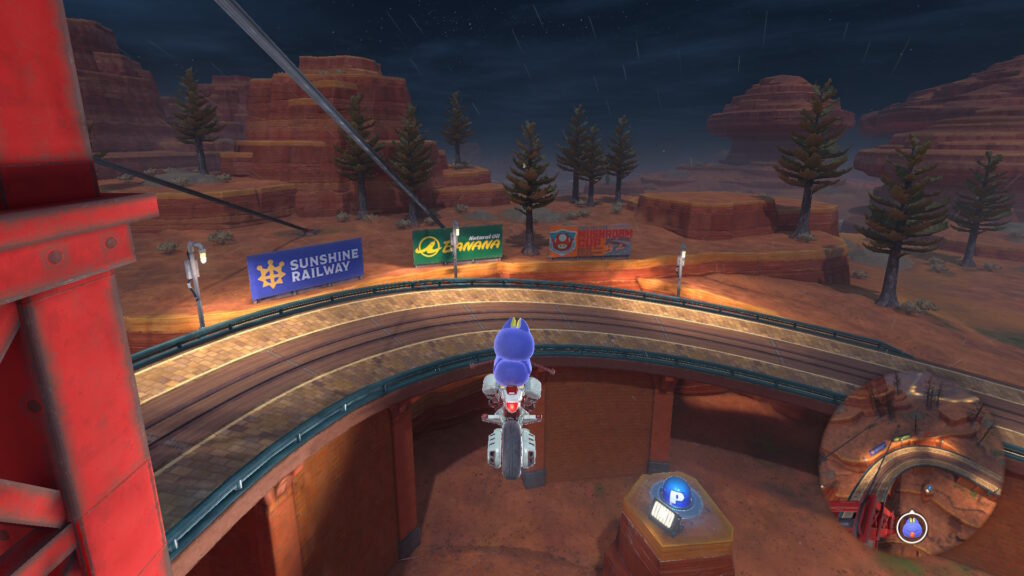 スタート地点真横(左)の道を進んで逆走し、そのまま進んでシュポポコースターの外に出て電線の左側のダートエリアを進みます。赤い橋の右側のレールに乗って進み、タイミングよくジャンプして上からPスイッチを押しましょう。