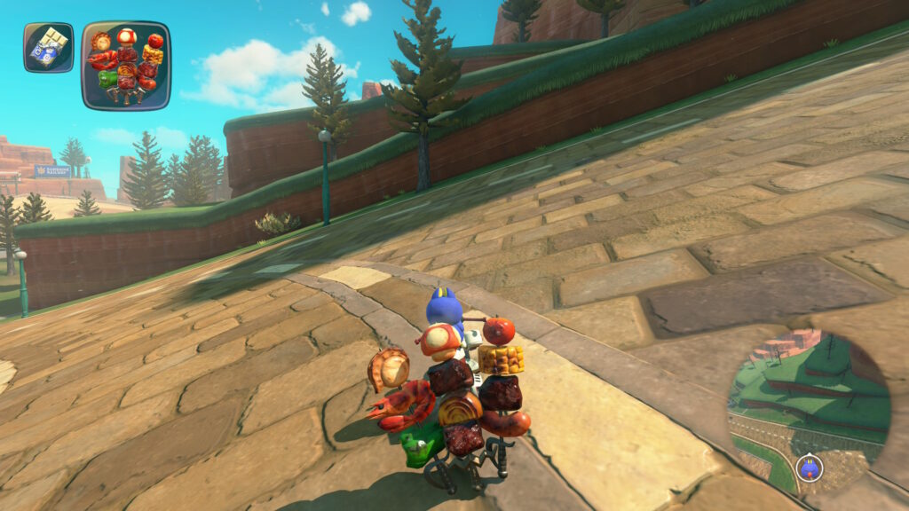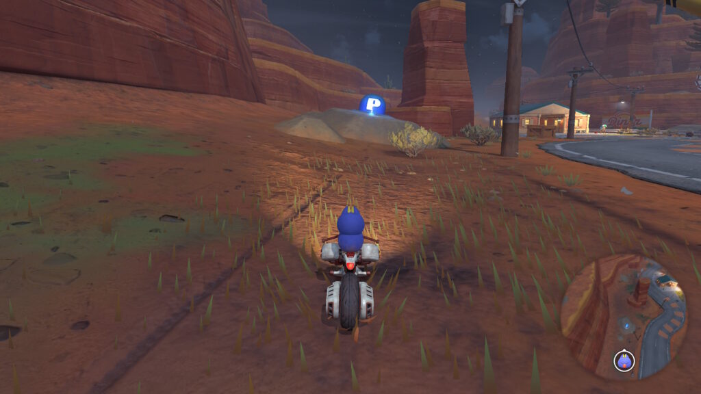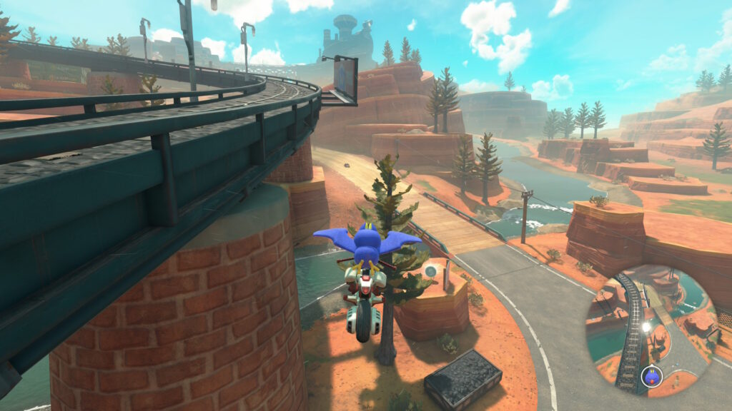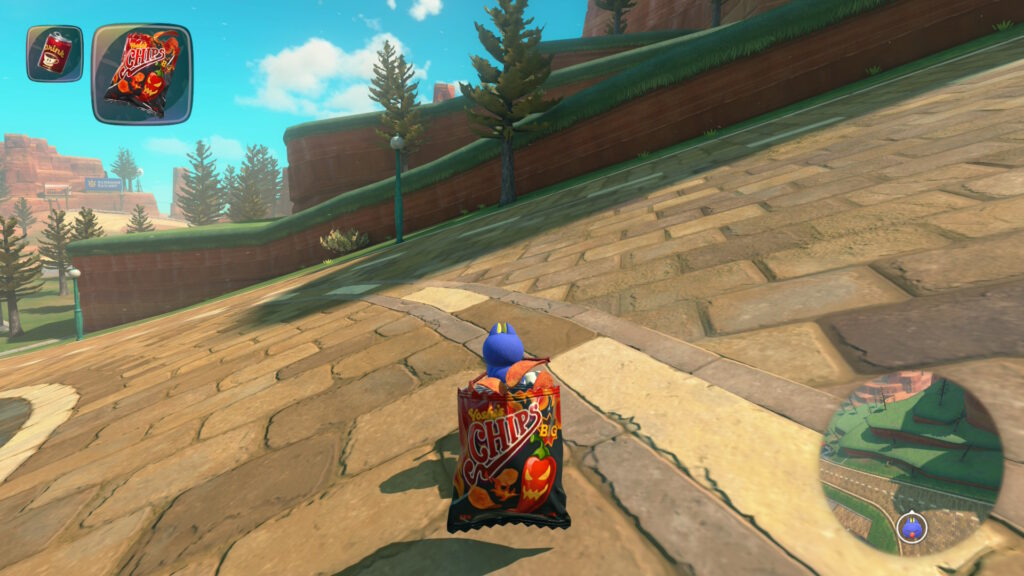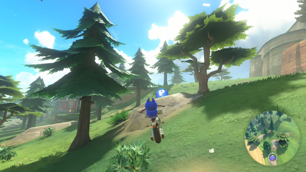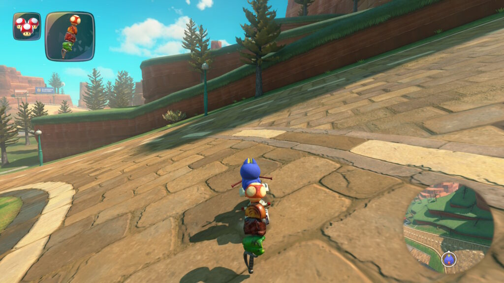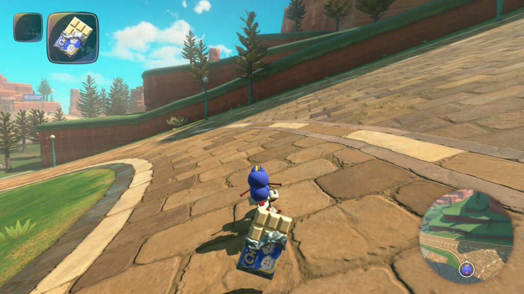 スタート地点から少しだけ進むと左側に赤い屋根がありその上を少し進むとグライダーがあるので、それに乗りましょう。そのまま真っ直ぐ飛ぶと道が見えてくるのでそのまま着地してその道を進みます。途中で分かれ道があるので左側を進みます。そのままその道を進むとハテナパネルがあります。