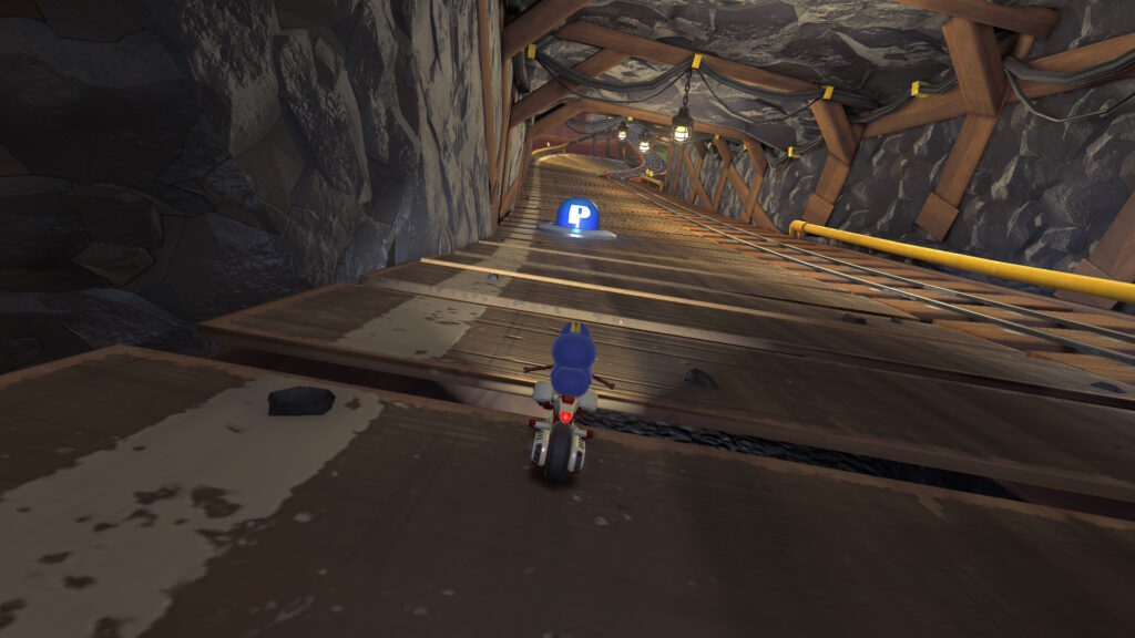 スタート地点から逆走し、3つのアイテムボックスがある場所で右に曲がりそのままその道を進み続けると赤い旗がついている道があるので、そこの前で左側に落ちると少し進んだ先にPスイッチがあります。