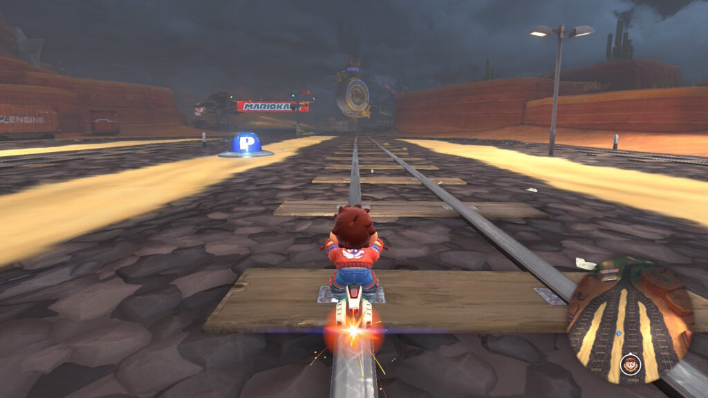 コース終盤では、レールには乗らずに左側のルートを進むと、8の字カーブエリアでショートカットができます。加速アイテムを使用してダート部分を抜け、ジャンプ台でジャンプアクションをすることで線路を飛び越えたショートカットができます。