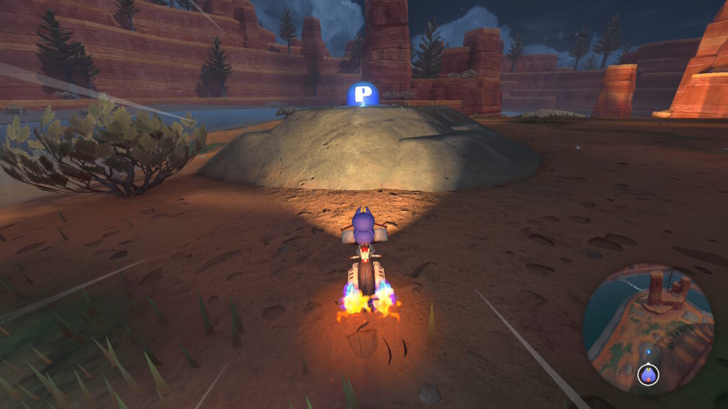 スタート地点から逆走して左に曲がり、次の分かれ道では左に曲がらず、そのままその道を進み続けると小さな橋があります。その橋の下にPスイッチがあります。