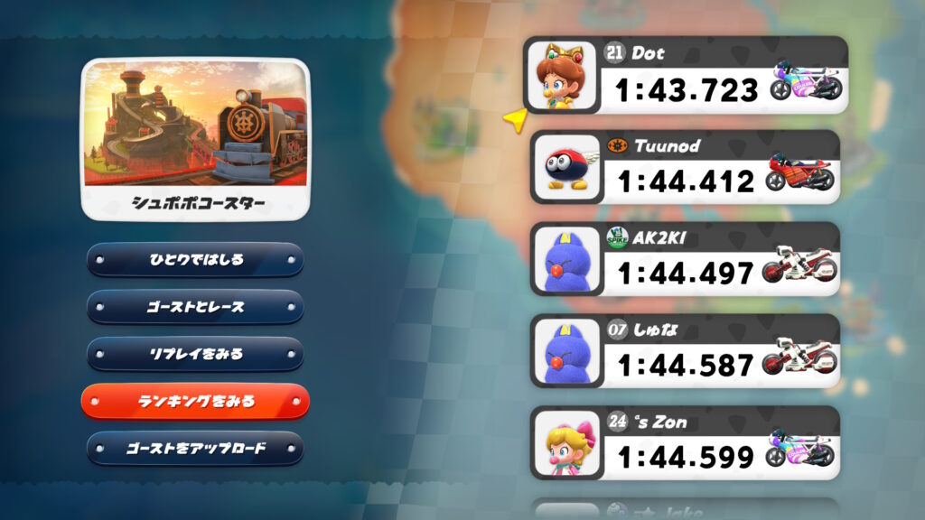 シュポポコースターの世界記録は「ひとりで」→「タイムアタック」→キャラとマシンを選択→コースを選択→「ランキングをみる」からTOP10の記録を見ることができます。